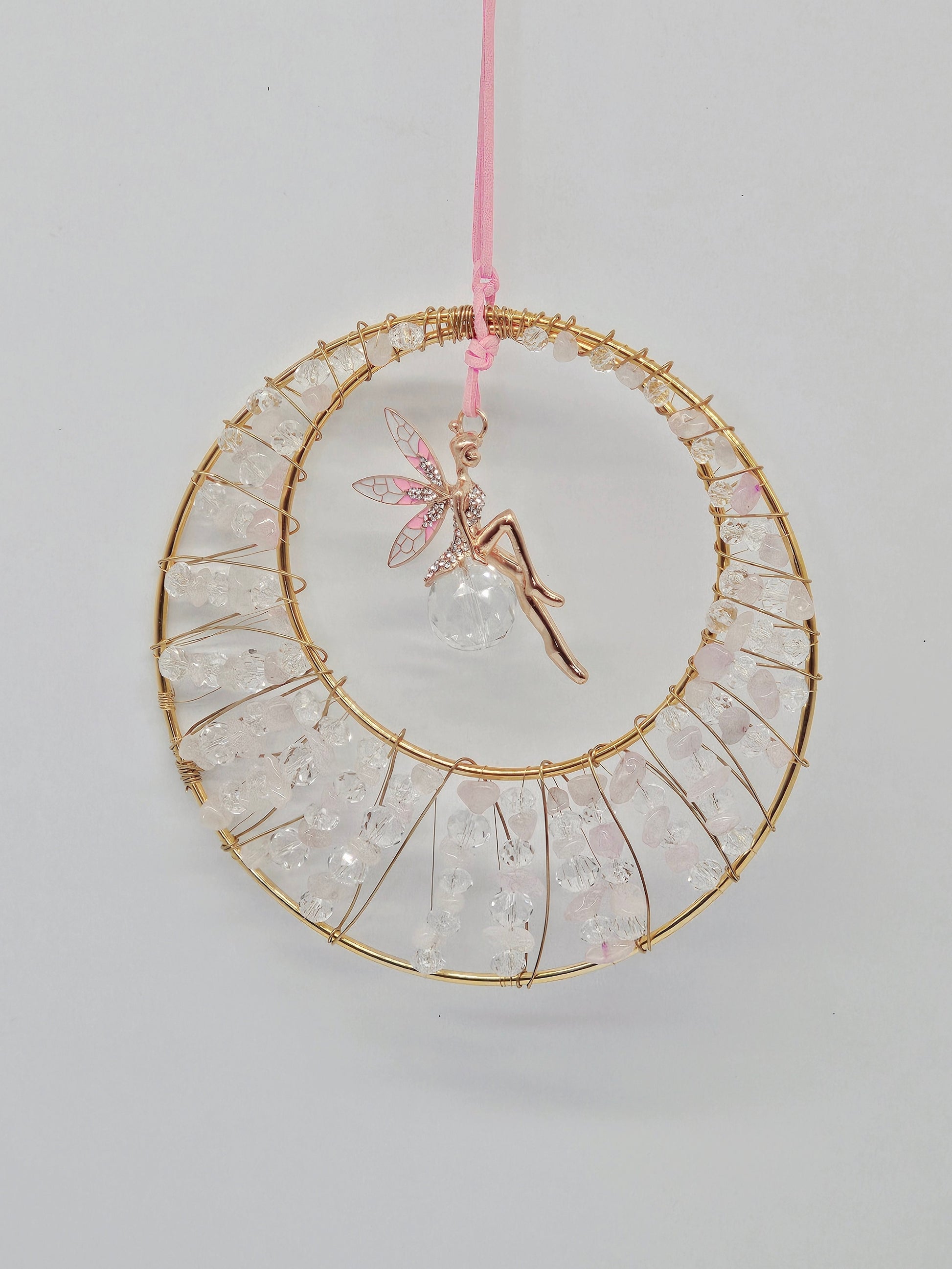 Bring a touch of enchantment into your space with this delicate pink fairy suncatcher. Crafted with shimmering glass and adorned with sparkling crystals, this whimsical piece captures sunlight beautifully, scattering soft rainbows and gentle hues across the room. The fairy’s intricate wings glisten with iridescent detail, while her graceful silhouette adds charm to any window, garden, or nursery.